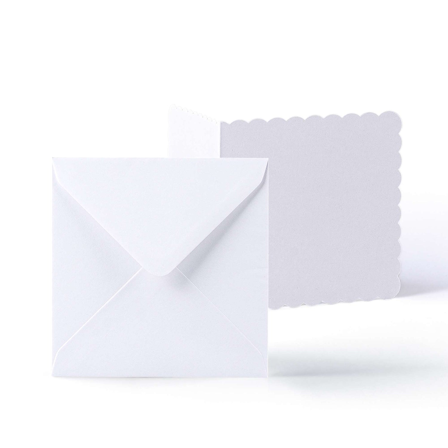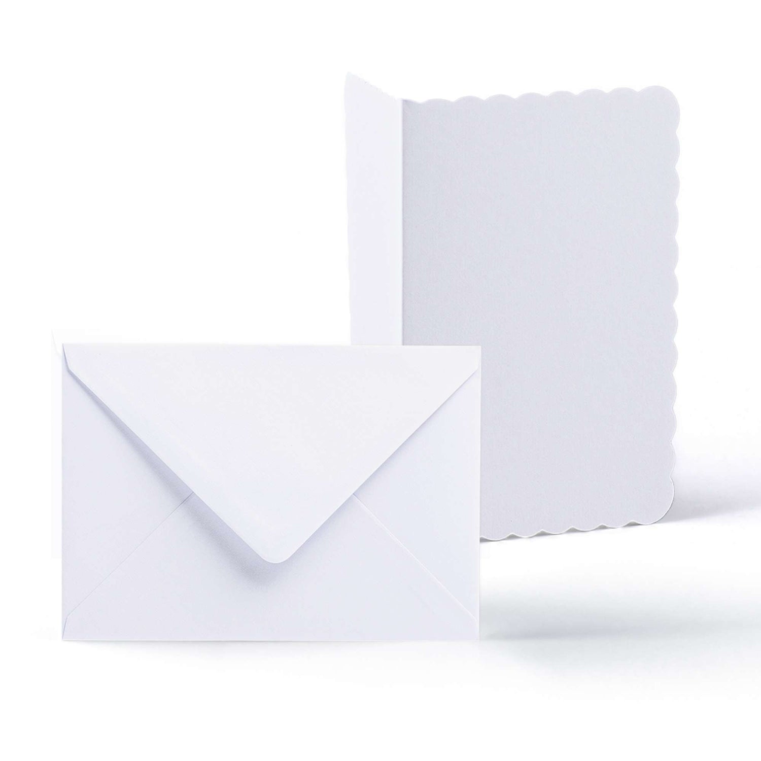 Elegant white scalloped cards (300 gsm) with matching envelopes (100 gsm).